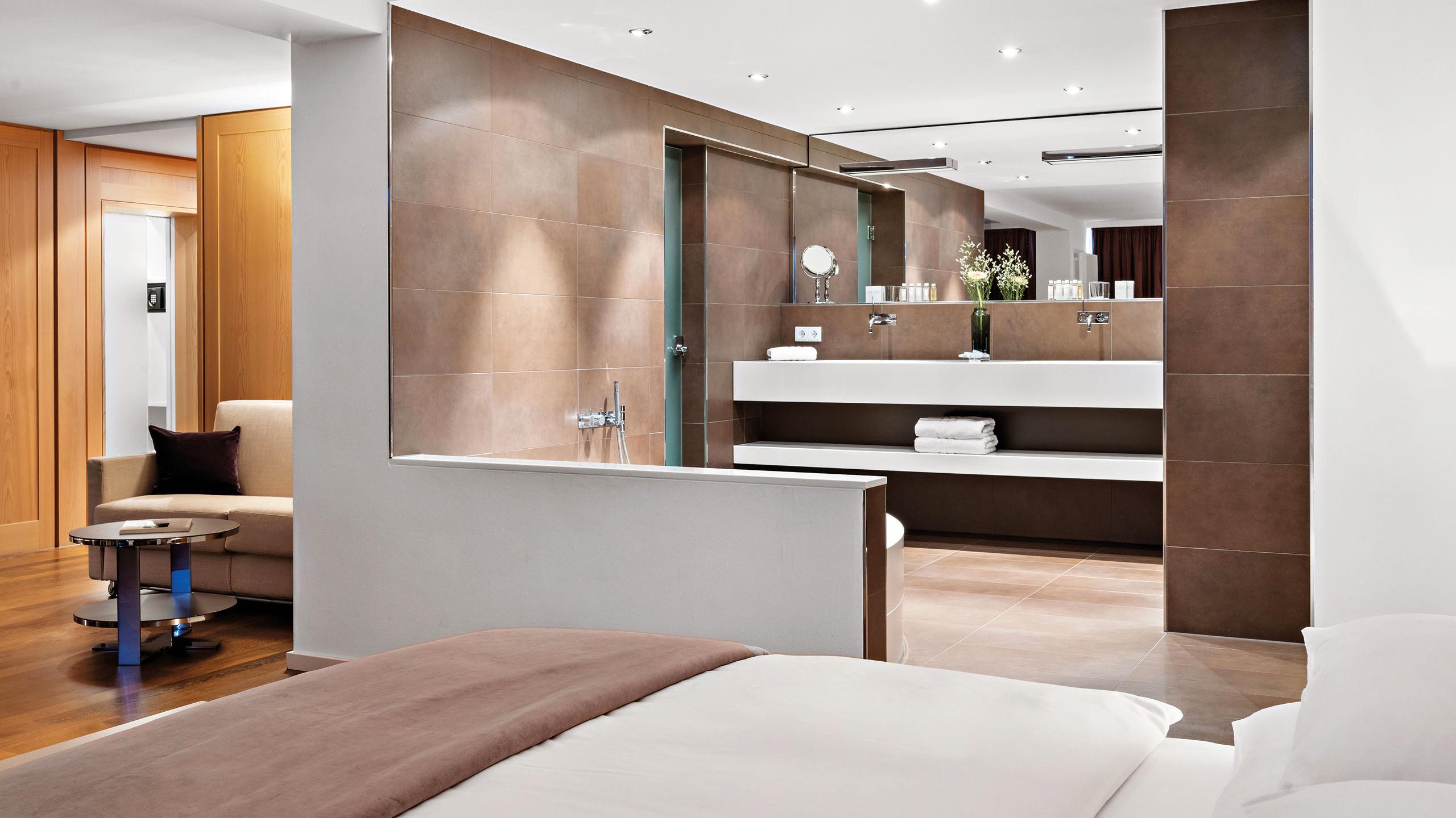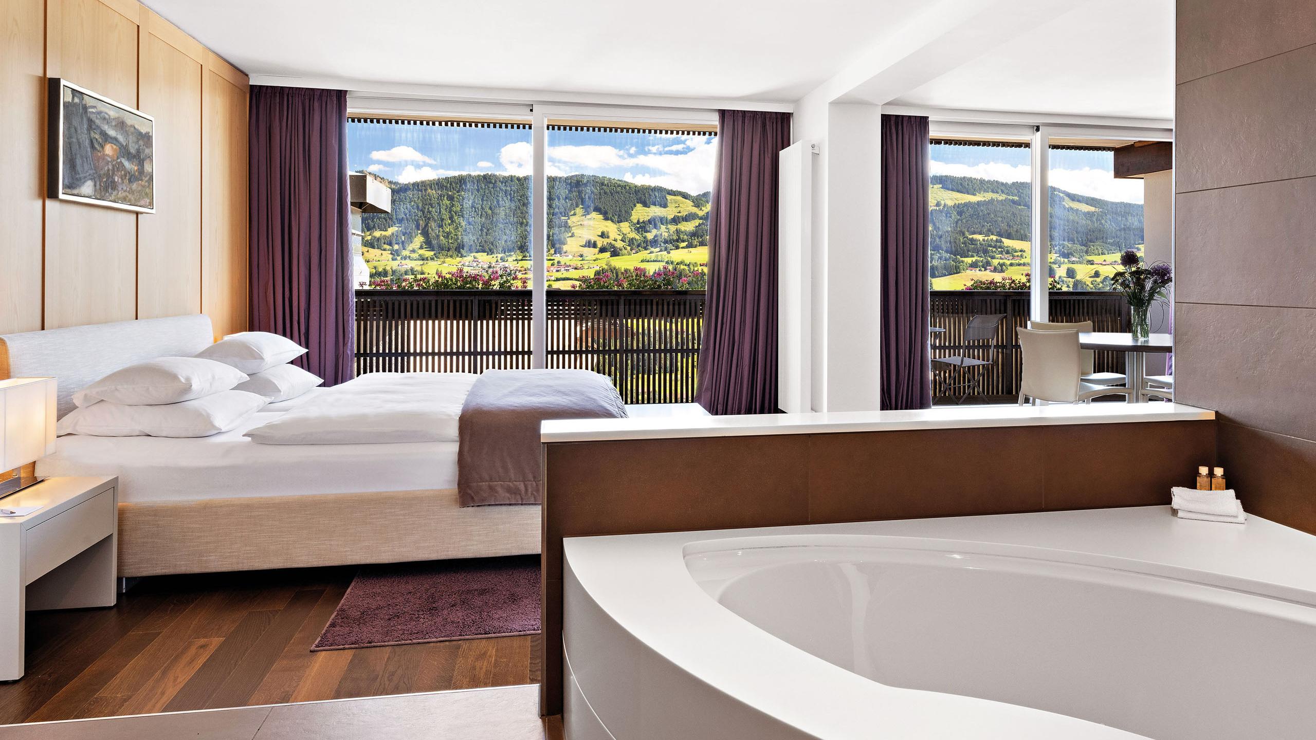 Unsere sonnendurchflutete Suite mit offenem Wohn- und Schlafbereich (Doppelbett 1,80 x 2,00 m) ist im modern-alpinen Stil mit Holzboden gehalten. Das großzügige und offene Badezimmer ist ausgestattet mit übergroßer Badewanne, Regendusche und separatem WC, der geräumige Wohnbereich mit Esstisch und einer gemütlichen Sofaecke. Zusätzlichen Komfort bietet der begehbare Kleiderschrank. Die Suite verfügt über bodentiefe Fenster und einen Südbalkon mit traumhaftem Bergpanoramablick.