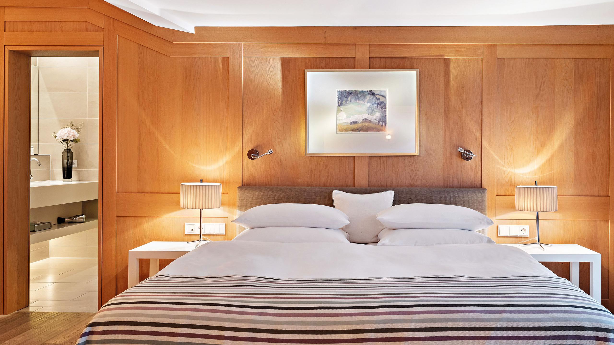 Unsere ca. 66 m² große Suite mit getrenntem Wohn- und Schlafzimmer (Boxspringbett 1,80 x 2,00 m) ist im modern-alpinen Stil mit Holzboden gehalten. Das großzügige Badezimmer ist ausgestattet mit Badewanne und Dusche, der geräumige Wohnbereich mit Esstisch und einer gemütlichen Sofaecke. Zusätzlichen Komfort bietet der begehbare Kleiderschrank. Die Suite verfügt über einen Ostbalkon an Schlafzimmer und Wohnzimmer.