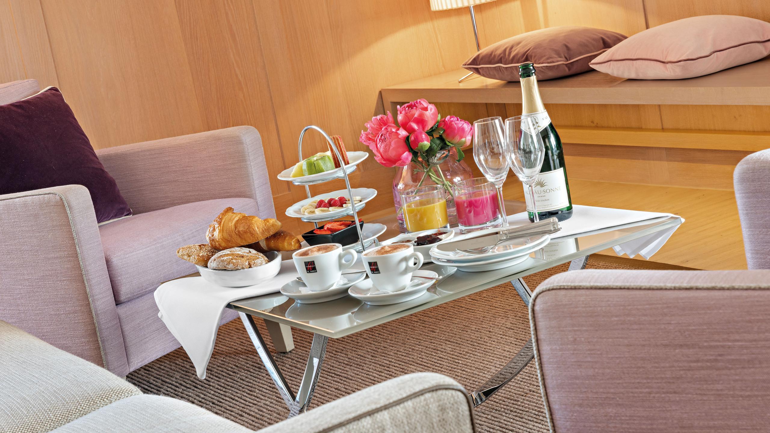 Unsere Suite mit getrenntem Wohn- und Schlafzimmer (Boxspringbett 1,80 x 2,00 m) ist im modern-alpinen Stil mit Holzboden gehalten. Das großzügige, sonnendurchflutete Badezimmer ist ausgestattet mit Badewanne, Dusche und separatem WC, der geräumige Wohnbereich in der Dachschräge mit Schreibtisch und einer gemütlichen Sofaecke. Zusätzlichen Komfort bietet der begehbare Kleiderschrank. Die Suite verfügt über einen Ostbalkon am Schlafzimmer sowie einen Südbalkon mit traumhaftem Bergpanoramablick an Badezimmer und Wohnzimmer.