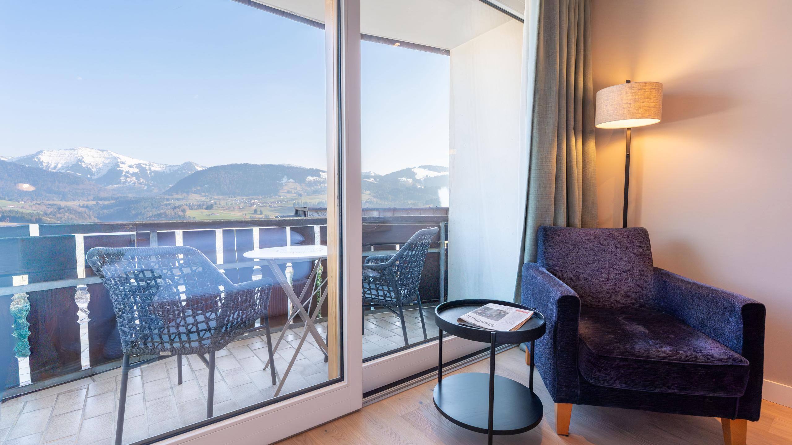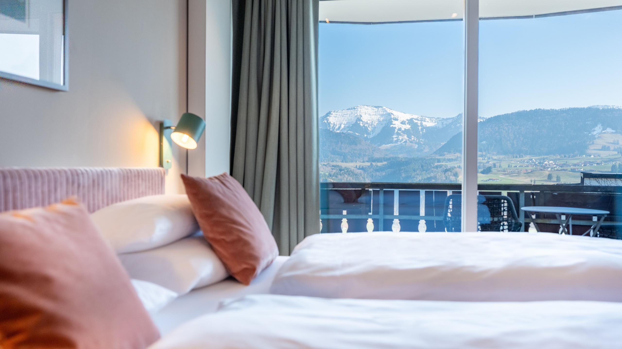 Unsere 25-31 m² großen, sonnendurchfluteten Doppelzimmer mit Doppelbett (1,80 x 2,00 m) verfügen über einen Südbalkon mit traumhaftem Bergpanoramablick, Parkett, Schreibtisch und Badezimmer mit Dusche.