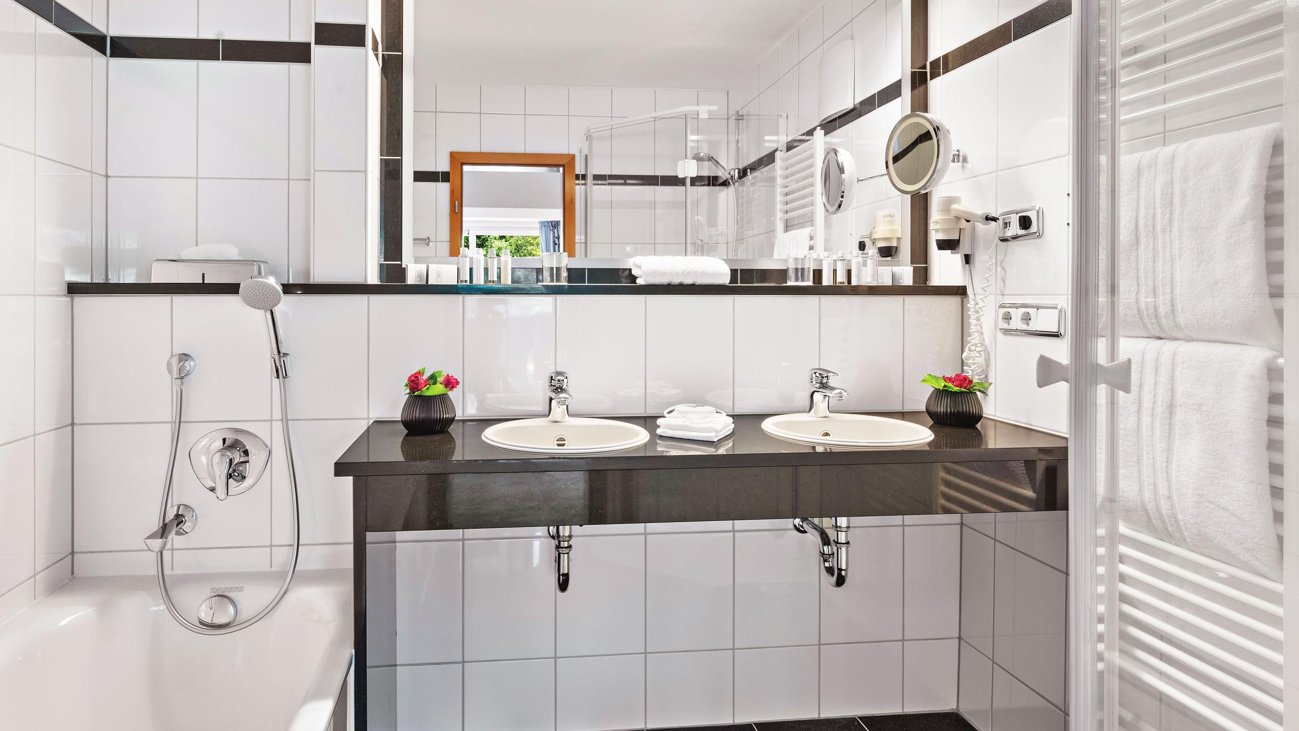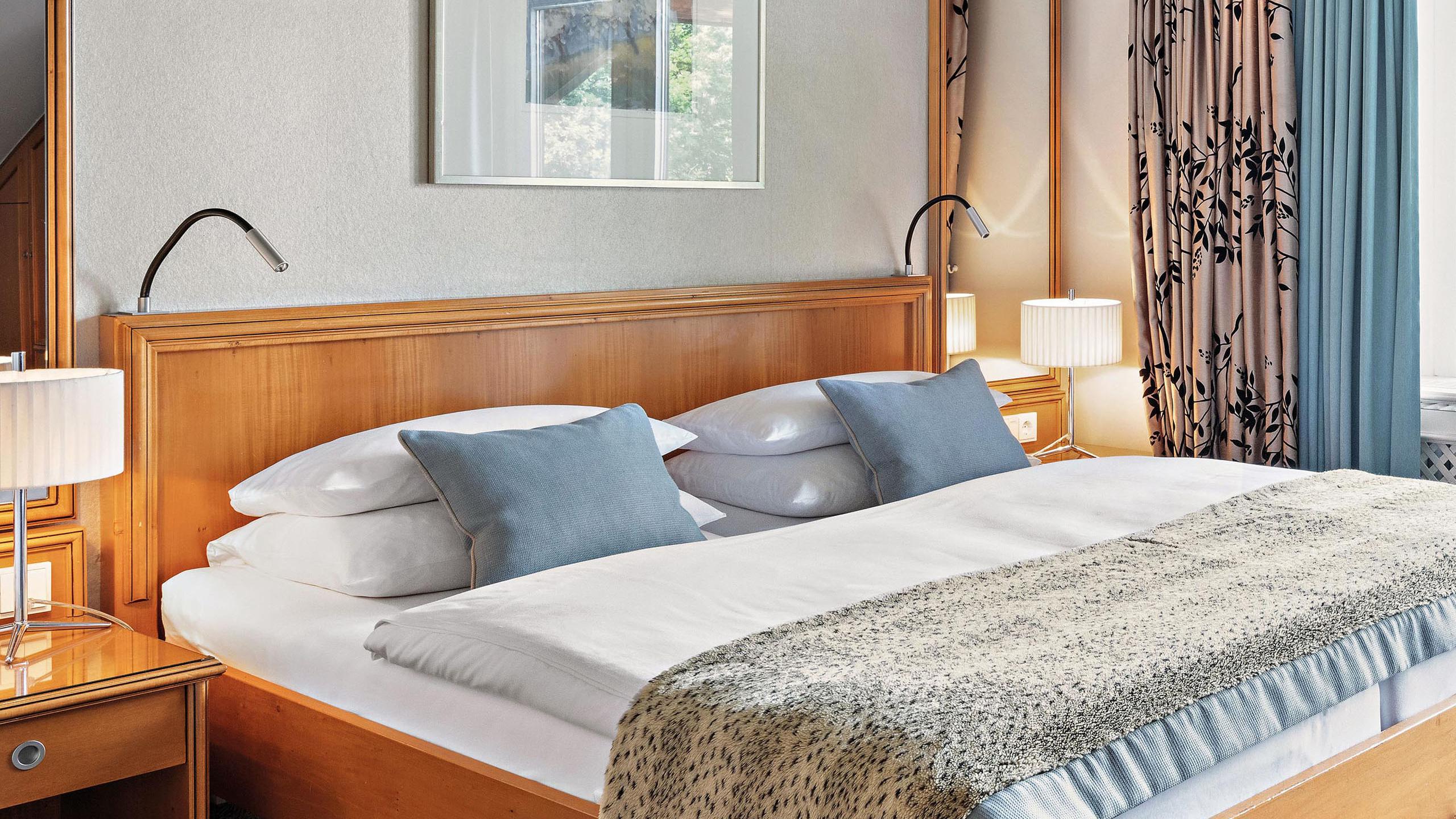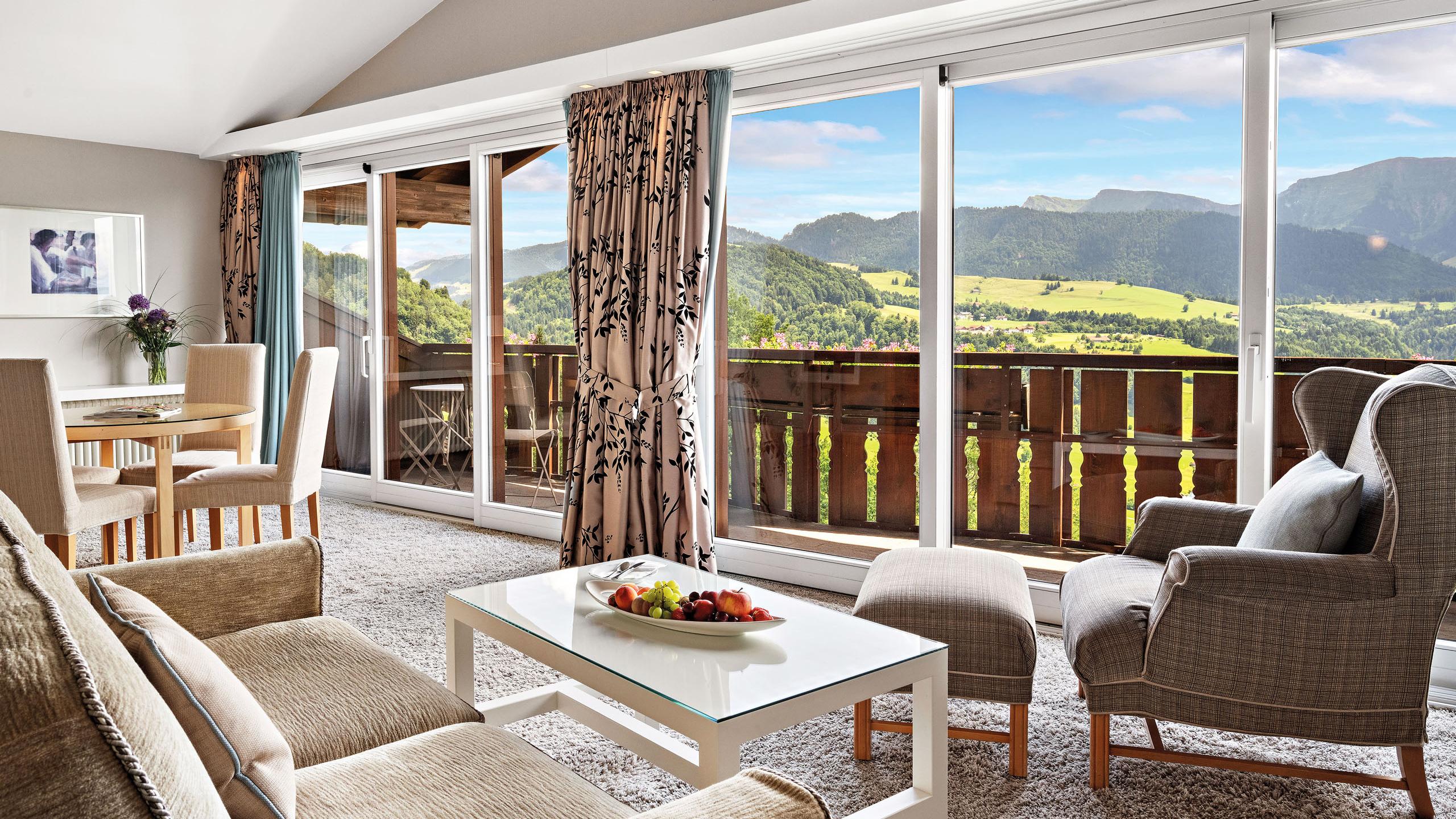 Unsere Suite mit getrenntem Wohn- und Schlafzimmer (Doppelbett 1,80 x 2,00 m) ist im zeitlos-eleganten Stil mit Hochflor-Teppichboden gehalten. Das Badezimmer ist ausgestattet mit Badewanne, Dusche und separatem WC, der geräumige Wohnbereich mit Esstisch, Schreibtisch und einer gemütlichen Sofaecke. Die Schlafcouch im Wohnzimmer lässt sich auf ca. 1,60 x 1,80 m ausziehen. Die Suite verfügt über einen Südbalkon mit traumhaftem Bergpanoramablick am Wohnzimmer und einen Ostbalkon am Schlafzimmer.