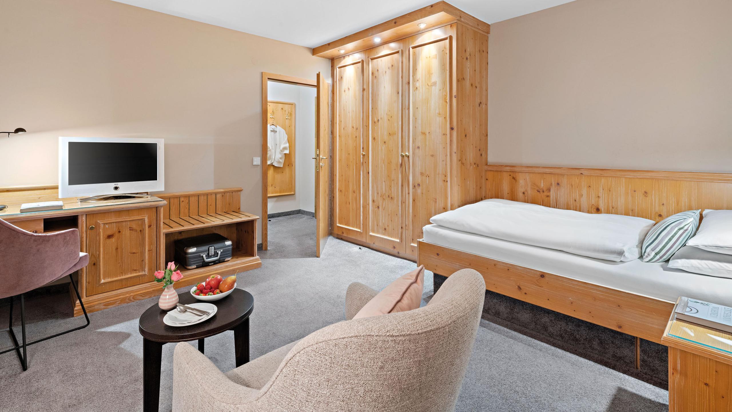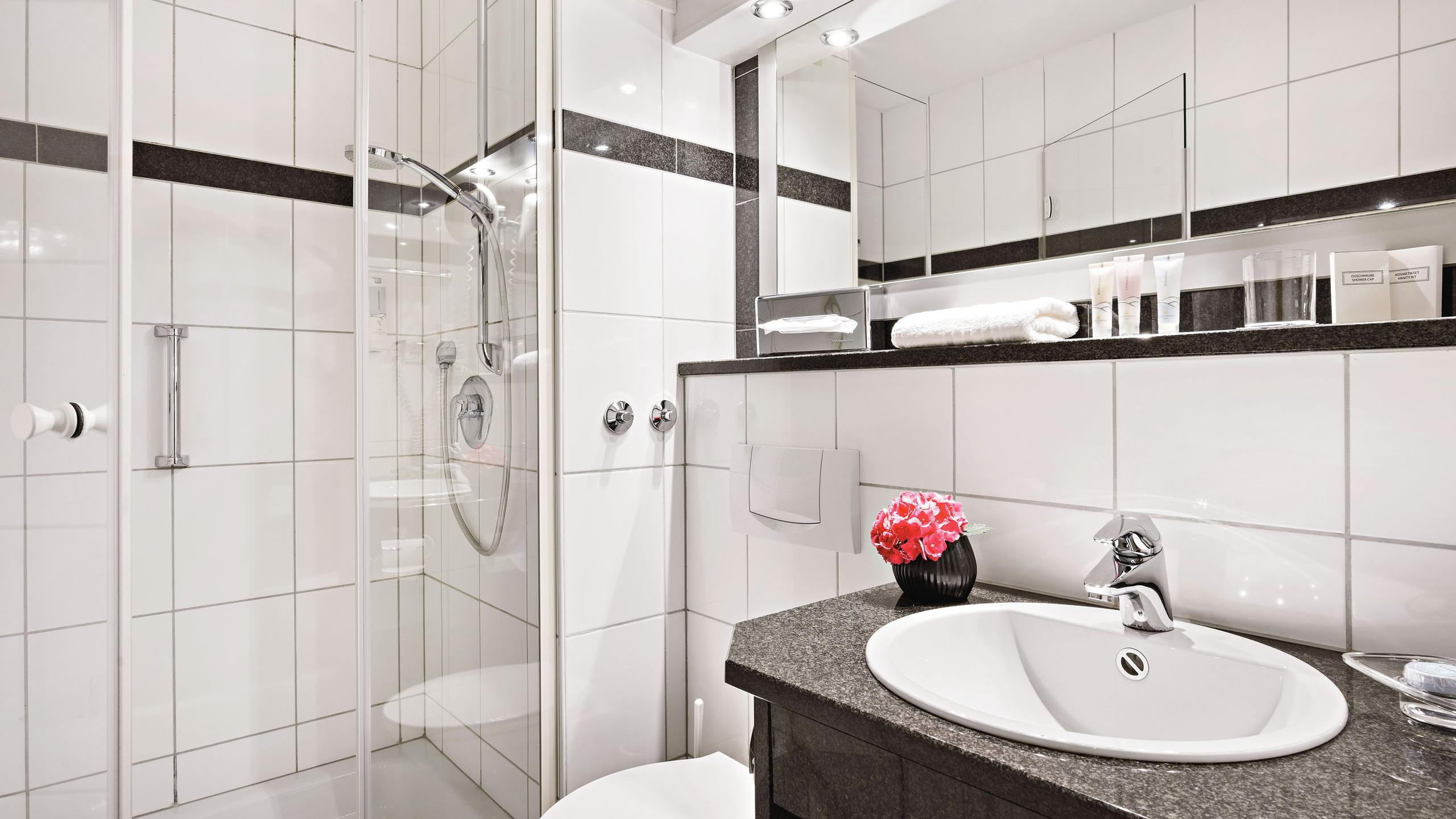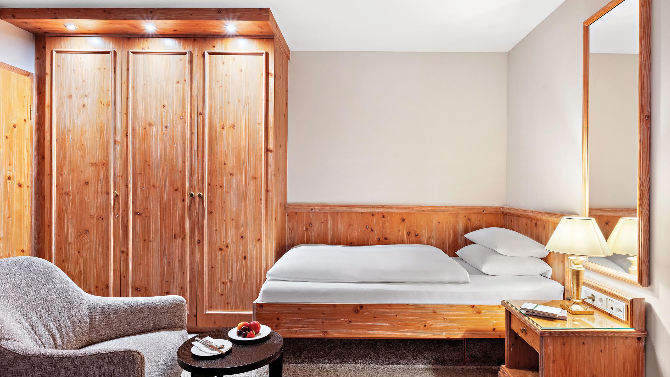 Unsere Einzelzimmer mit Einzelbett (1,10 bzw. 1,40 x 2,00 m) sind funktional eingerichtet und verfügen über Teppich, Schreibtisch und Badezimmer mit Dusche. Zimmer in dieser Kategorie sind der Nordseite zugewandt mit eingeschränktem Blick auf den Innenhof, teilweise mit Balkon.