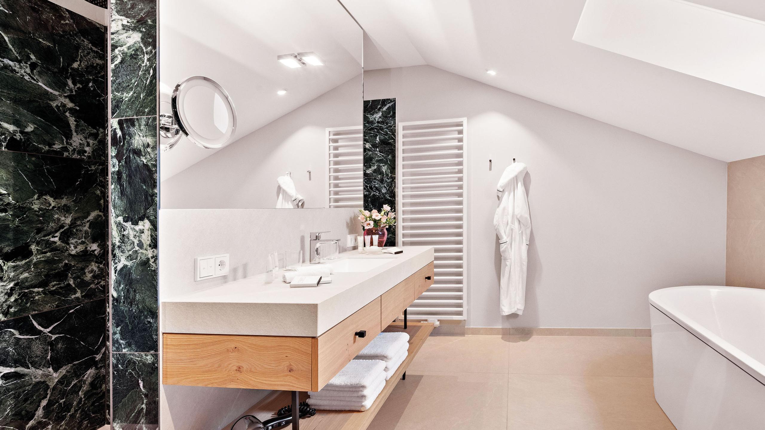 Unsere großzügigen Studios im Dachgeschoss des Landhauses Ifen wurden neu gestaltet und sind über einen kurzen Fußweg durchs Freie zu erreichen. Der offene Wohn-/Schlafbereich verfügt über ein Doppelbett (1,80 x 2,00 m), eine Schlafcouch (1,40 x 1,80 m) im Wohnbereich und Holzboden. Das großzügige Bad mit Tageslicht sowie Badewanne und Dusche grenzt direkt an das Schlafzimmer. Der Balkon bietet einen seitlichen Bergblick.