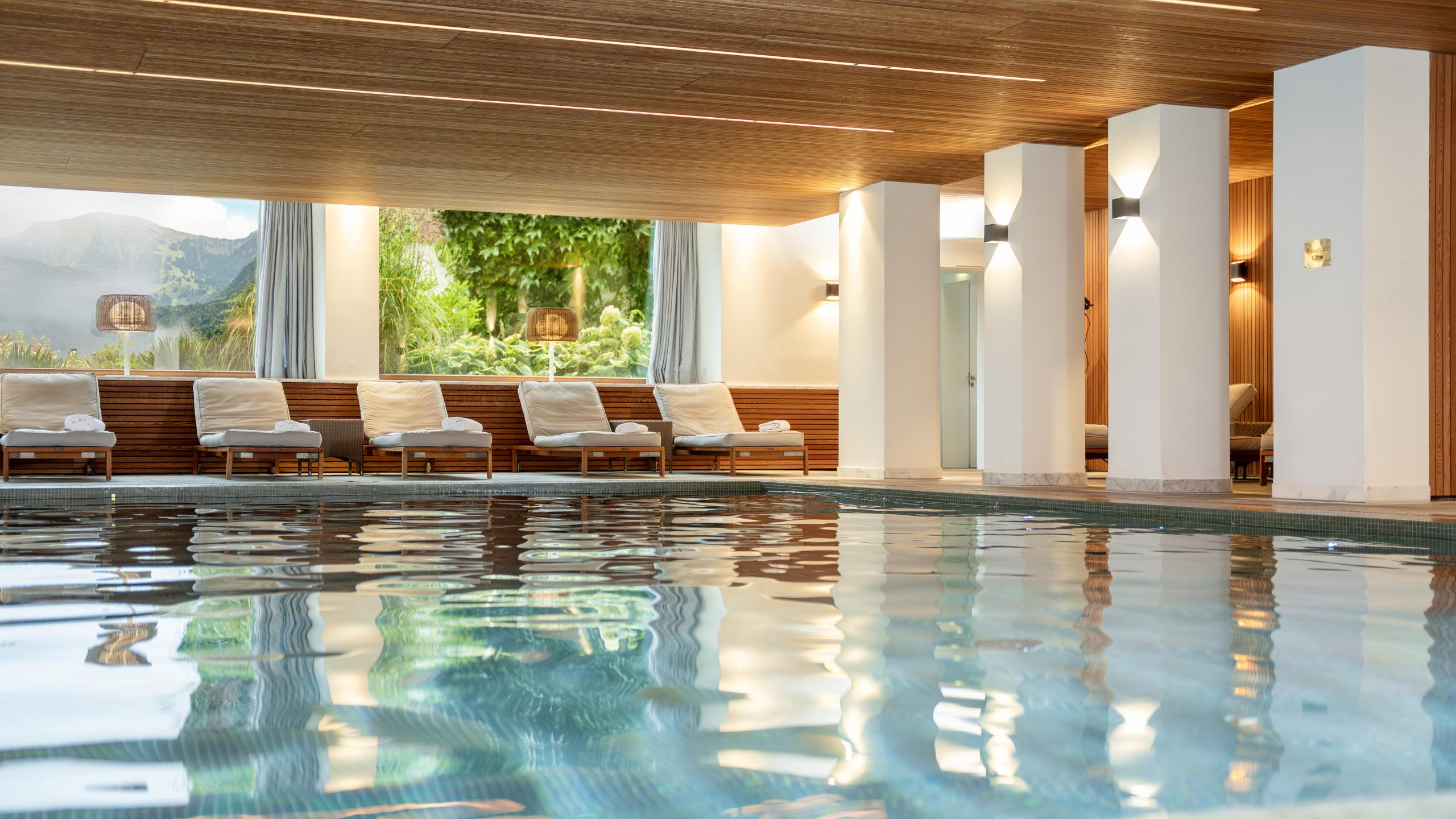 - 2.100 m² große Wellnesswelt mit zwei Innen- und einem beheizten Außenpool (im Sommer), Whirlpool, finnischer Panoramasauna und Dampfbad